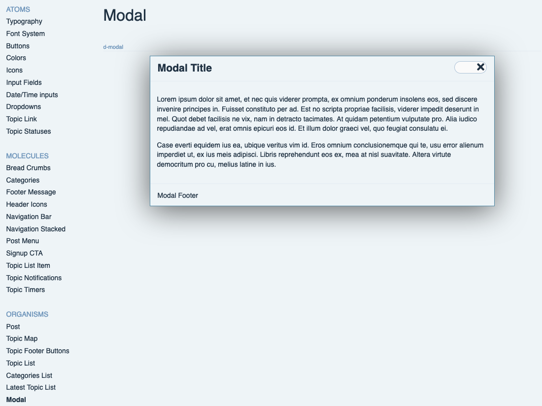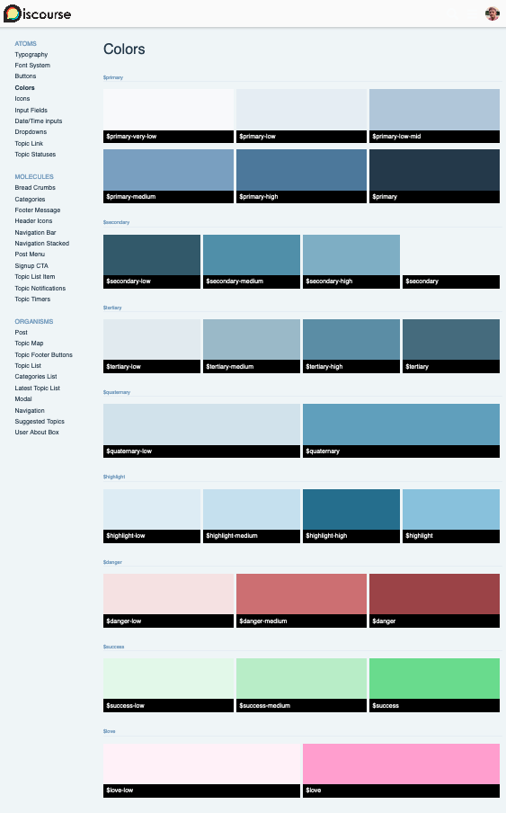 The Styleguide is a very helpful section to look at when you are creating a custom theme. Each Atom will show you how certain elements of Discourse will look with your styles applied.