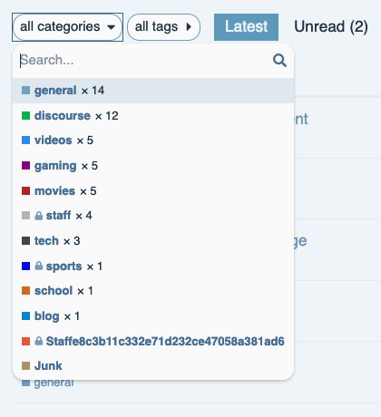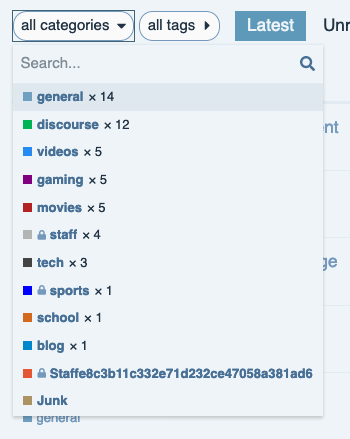 The leftmost area is the category/tag filter dropdowns, followed by the navigation links, ended with the New Topic button.