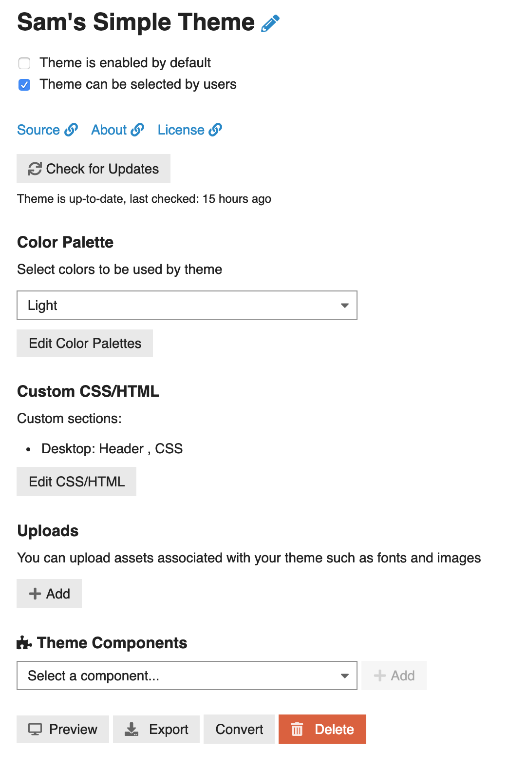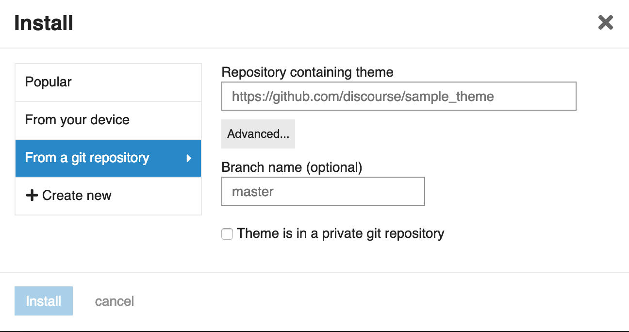 Discourse supports native themes that can be sourced from a .tar.gz archive or from a remote git repository including private repositories.